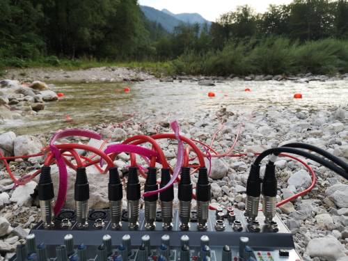 After several years of research and recording of underwater sounds around the world, we wanted to set up a sound installation that could take up certain elements of this research while proposing a form of sculpture that would be part of the surroundings without interrupting it - but rather with a view to revealing it, opening up another listening area and transforming thecurrents of the flow int o a spatialization of music composed of liquid sounds.